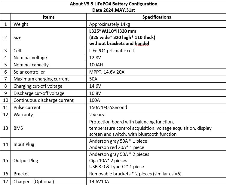 To Simplify is for you - what features does the V5.5 Have. 2 x Ciga 10amp outputs, 2 x Anderson 50amp outputs, 1 x Dual Fast USB - C, Internal 20amp MPPT solar controller (connect <=30att solar panel directly to the red anderson) 1 x 50amp Regulated anderson. All grey anderson are bi-directional 100amp constant output